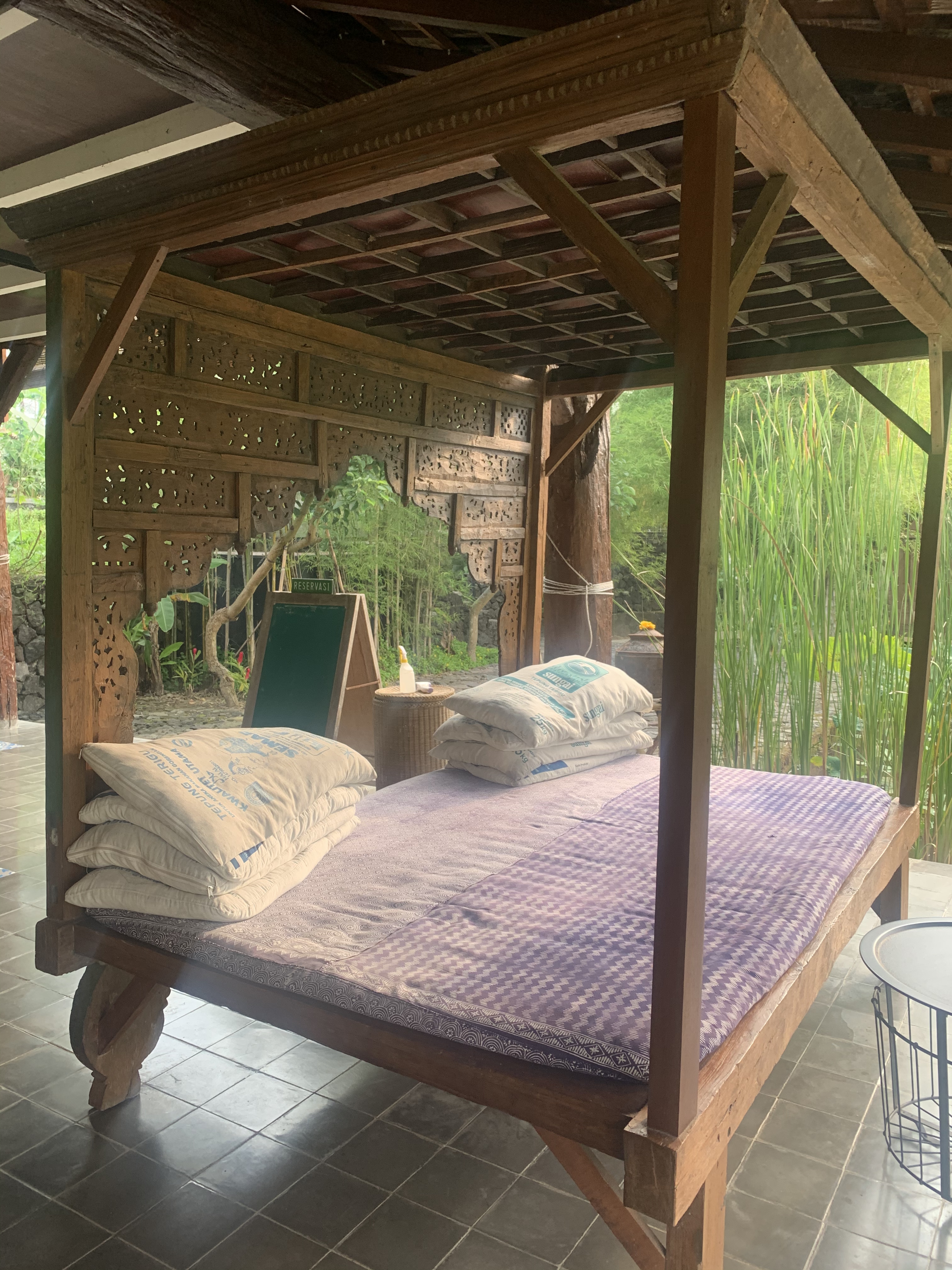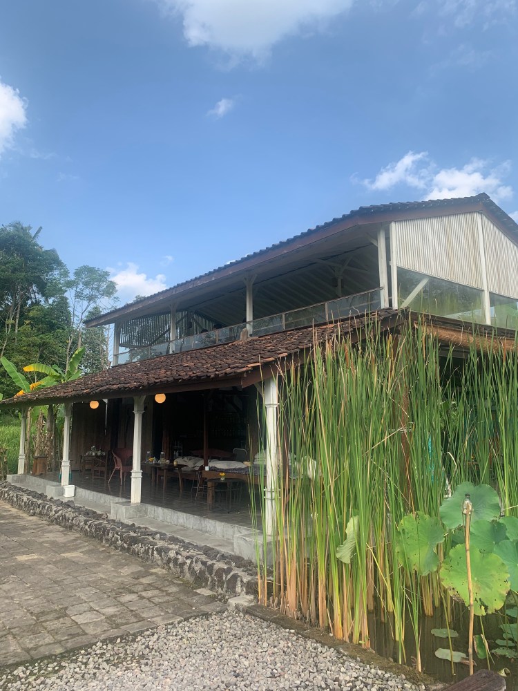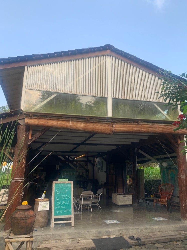 Bangunan utama resto ini yaitu berupa area terbuka menghadap alam, yang didominasi dengan perabotan kayu dengan model klasik. Ada tempat tidur yang empuk dengan tumpukan bantal yang sangat nyaman untuk berbaring selagi menunggu makanan yang dihidangkan. Dan juga ada beberapa permainan lawas yang bisa kita mainkan, seperti congklak.