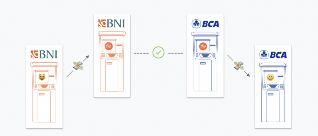 Flip bekerja sebagai jembatan transaksi antar bank. Kita hanya perlu melakukan transfer terlebih dahulu ke rekening Flip yang sama dengan bank yang kita miliki yang disertai dengan kode unik. Kemudian Flip akan meneruskan nominal yang ingin di transfer ke rekening tujuan.