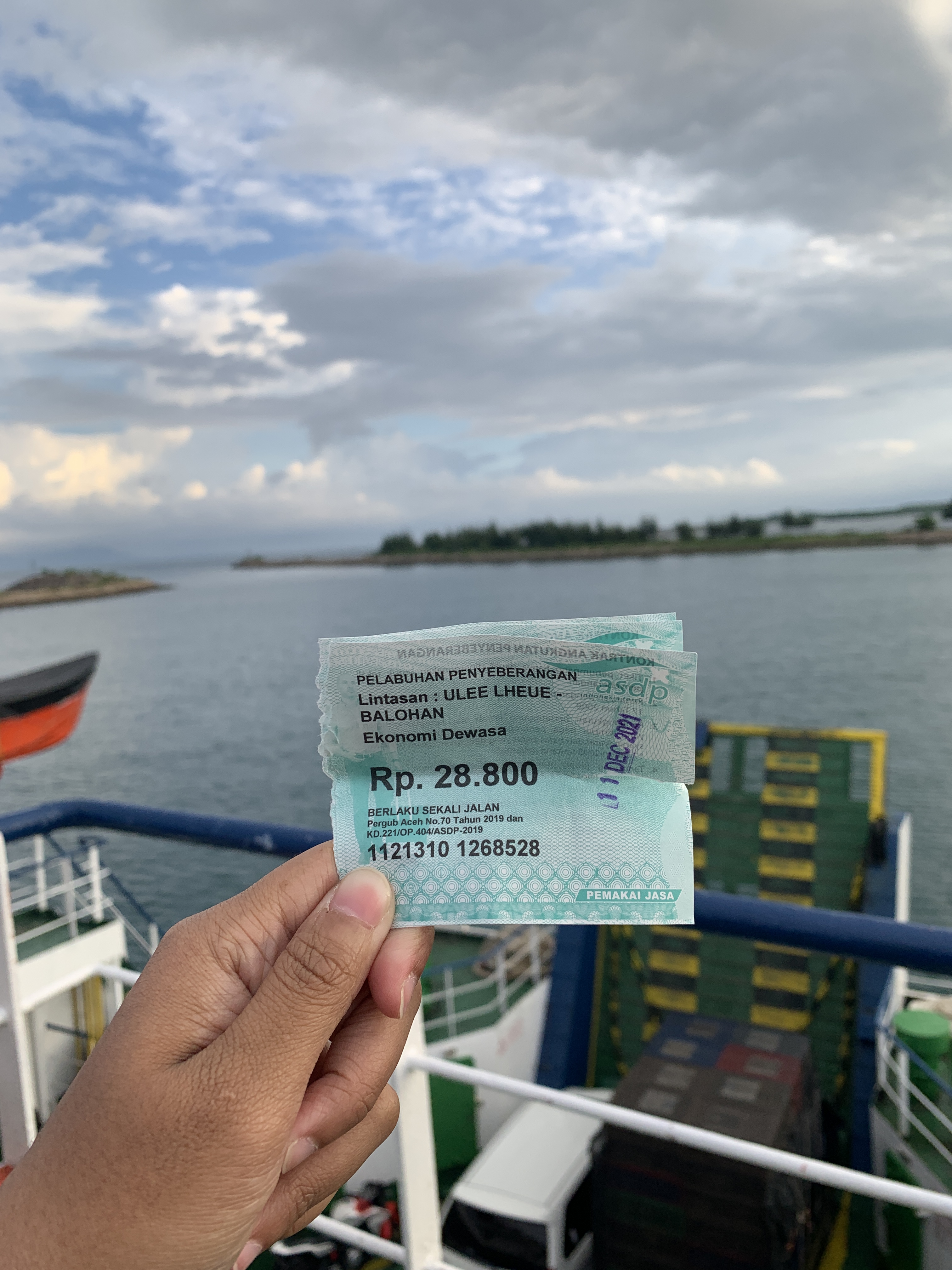 Untuk menuju Sabang, kita harus menyebrang menggunakan kapal dari Pelabuhan Ulee Lheue di Banda Aceh menuju Pelabuhan Balohan. Terdapat 2 jenis kapal, yaitu kapal lambat dan kapal cepat. Bedanya tentunya pada jarak tempuh dan fasilitas didalamnya. Perginya aku menggunakan kapal lambat, dengan harga Rp 28.800 yang ditempuh dengan waktu 2 jam.