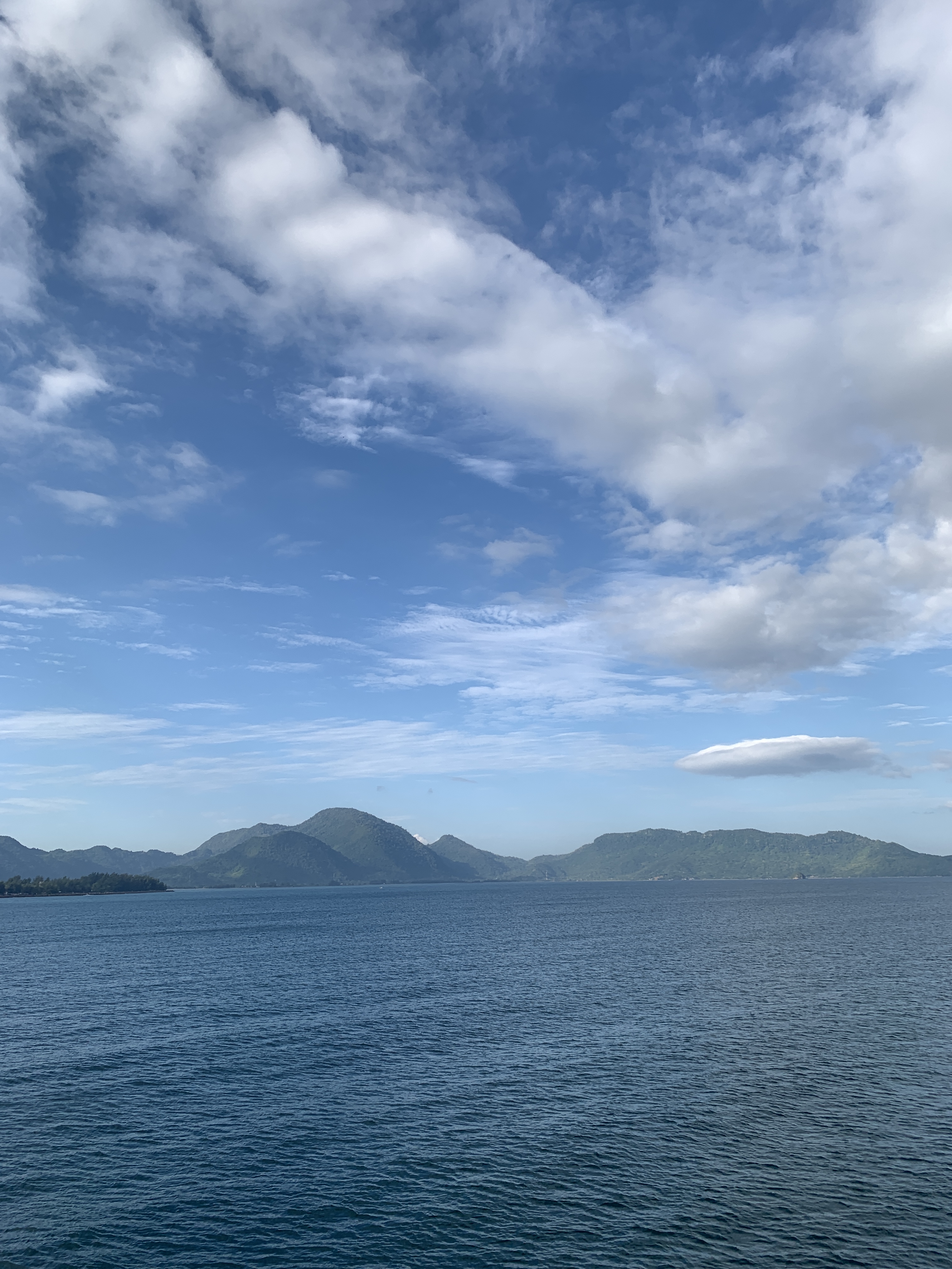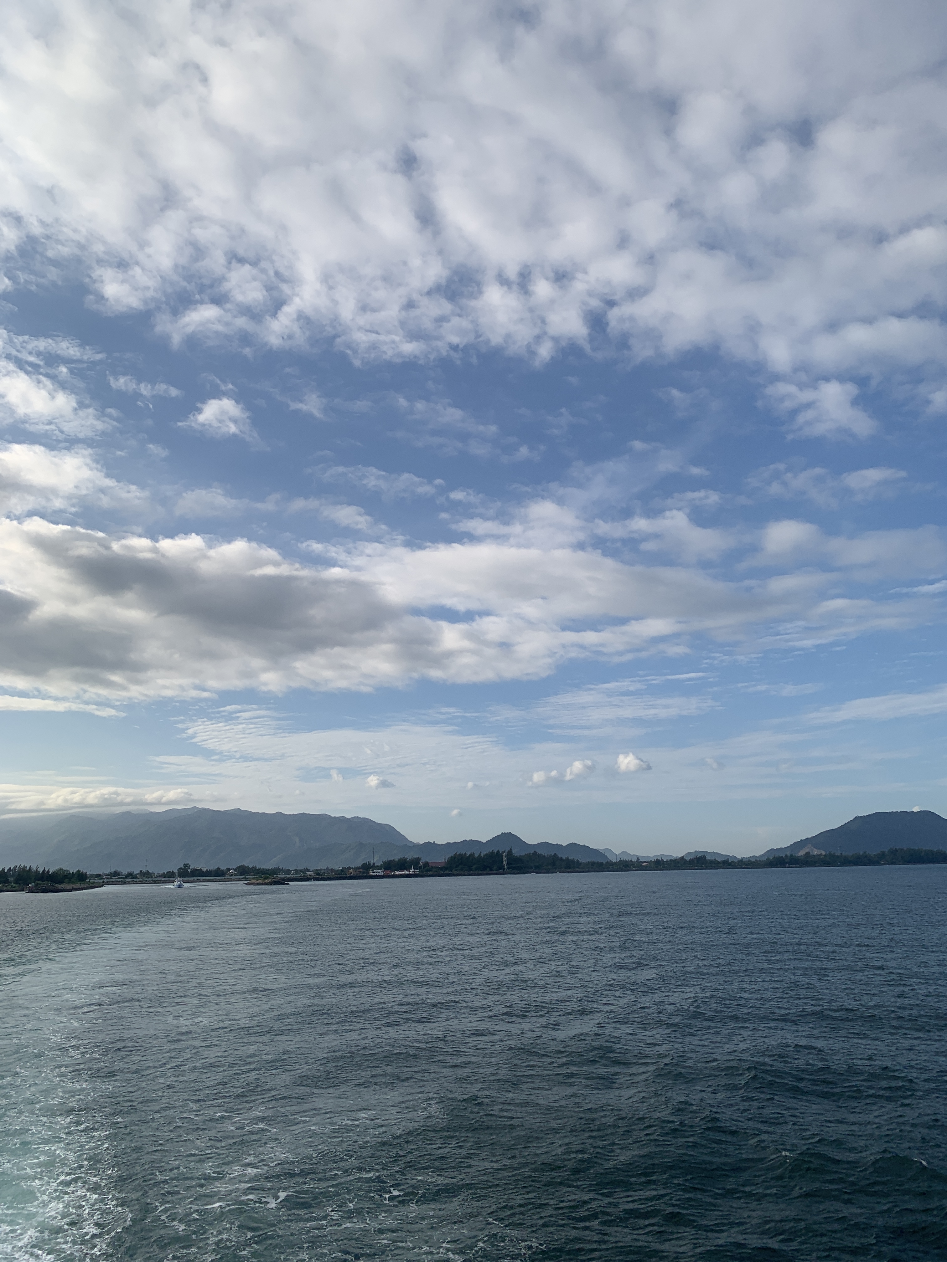 Perjalanan menuju Pelabuhan Balohan ini disuguhkan dengan pemandaagan yang indah. Perbukitan hijau yang membentang, air laut dan ombak yang tenang, angin yang berhembus dengan halus, serta langit yang biru sedikit awan membuat perjalanan ini begitu menyenangkan.