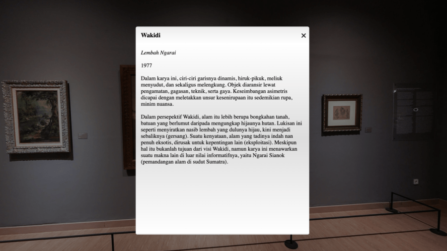 Virtual tour galeri ini bisa sebagai media belajar anak sekolah tentang pengenalan karya seni Indonesia dari masa ke masa. Apalagi kita bisa berulang kali mengunjungi websitenya. Dan tentunya untuk kita yang belum punya waktu untuk datang langsung ke lokasi. Semoga bisa membuat harimu menyenangkan yaa dengan mengikuti virtual trip ini!