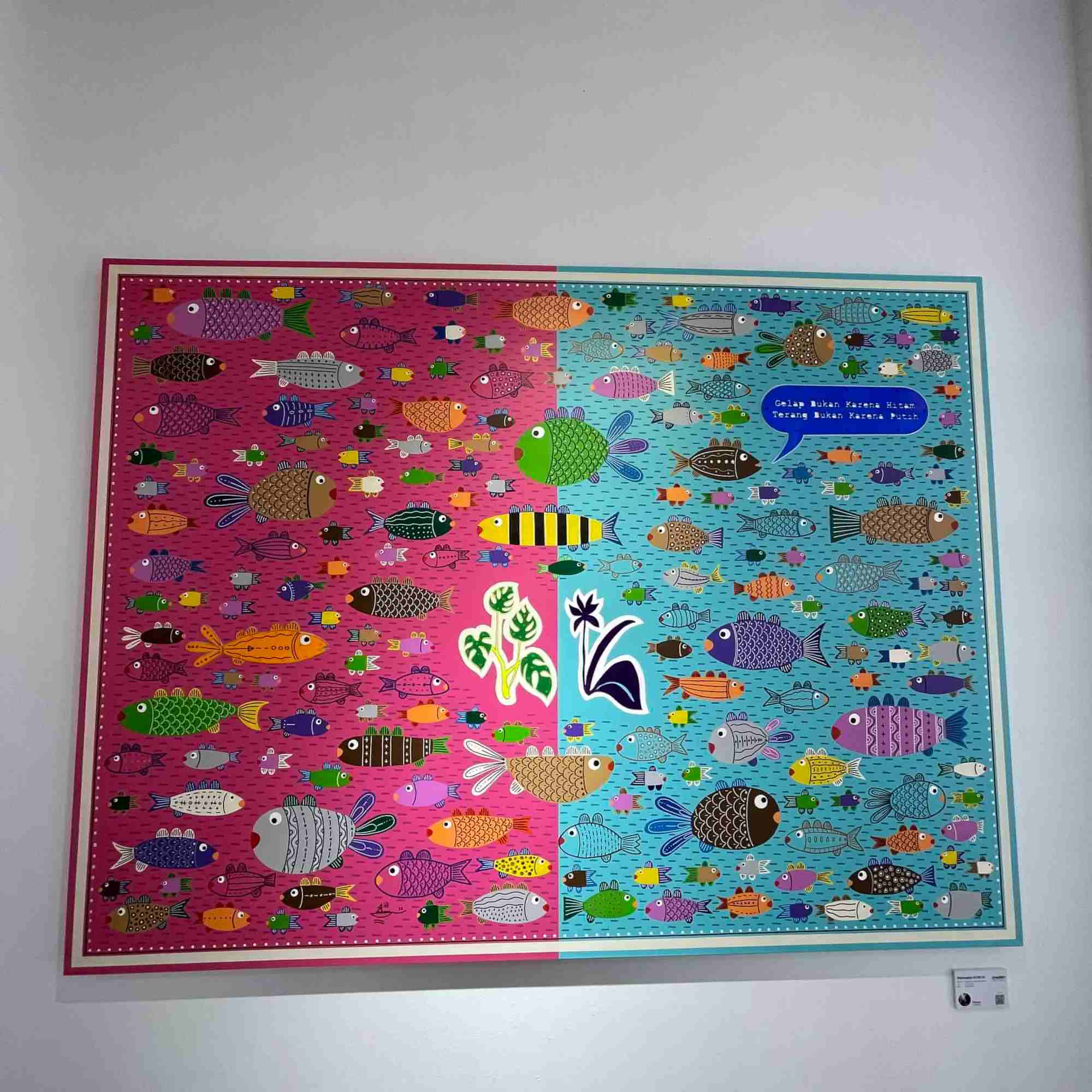 Pada konsep 2madison Berkumpul ini, aku jatuh hati dengan karya seniman Erianto asal Yogyakarta. Kenapa? Karena karyanya disini menggunakan simbol pigur ikan yang katanya sebagai perwujudan refleksi manusia yang hidup secara sosial, bersama berkelompok dan berkomunitas.