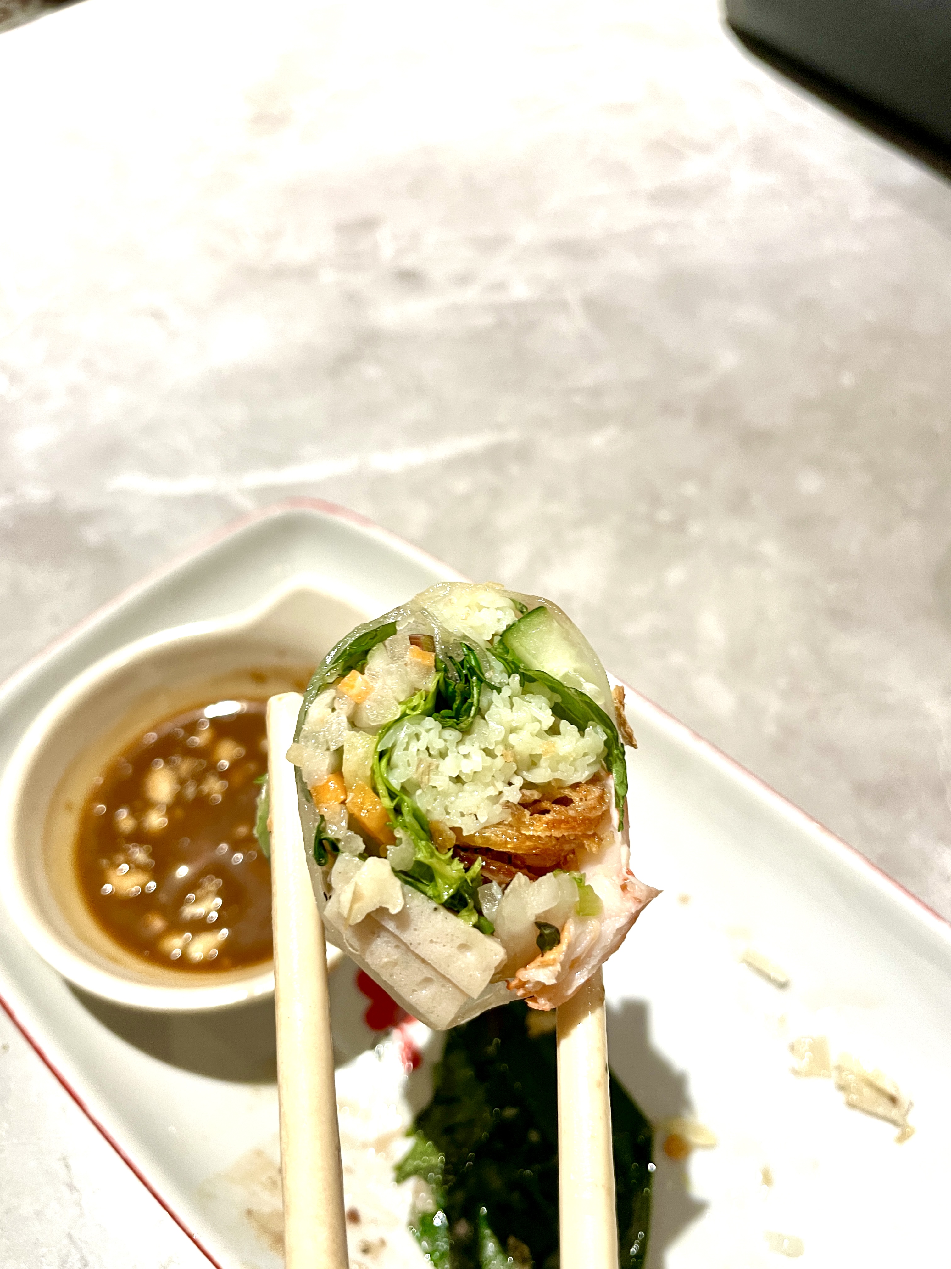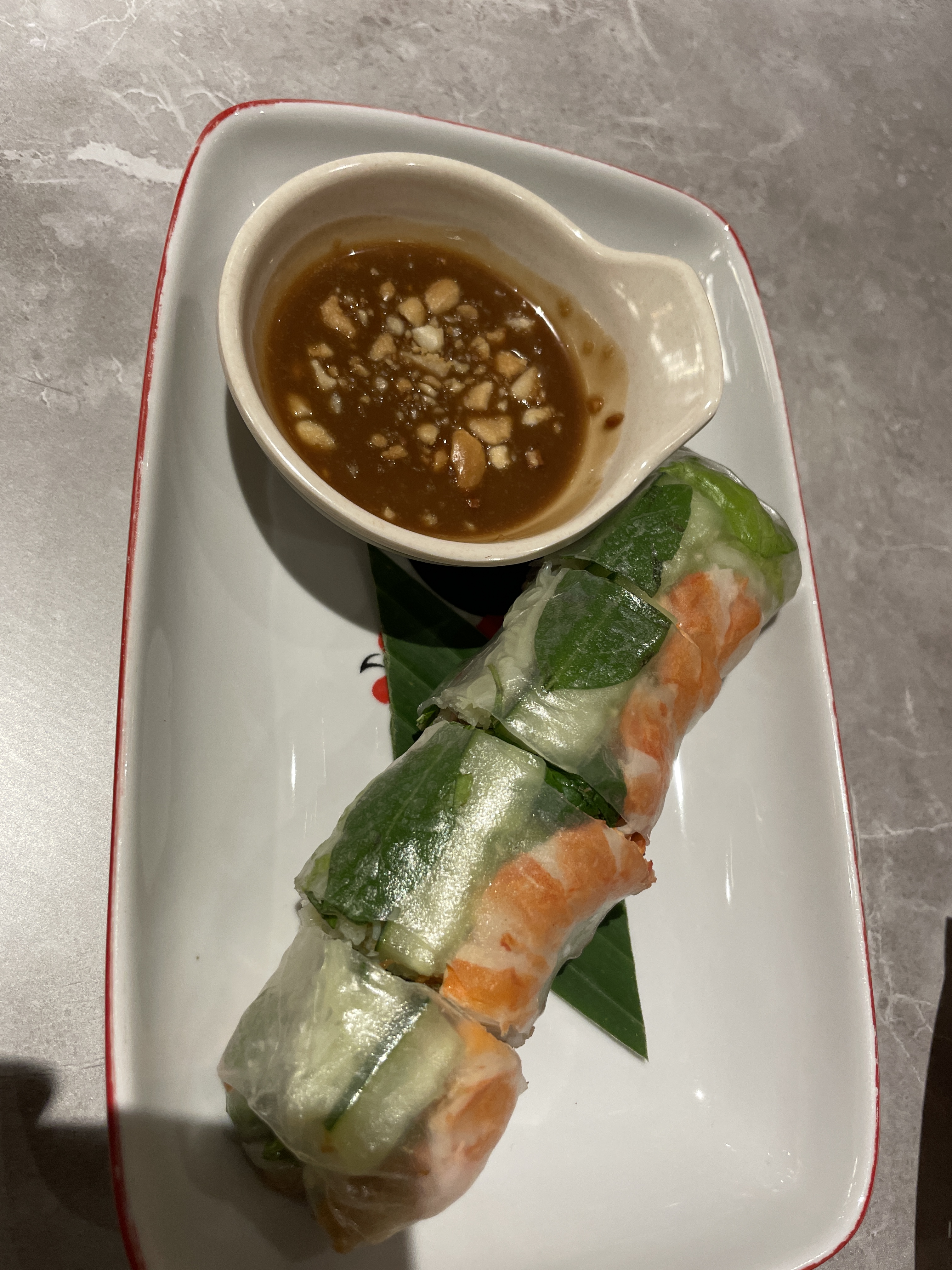 Menu terakhir yang kami pesan adalah rice paper rolls. Sebelumnya aku sudah pernah coba ini yang biasanya disebut spring rolls, aku beli saat ada bazaar di suatu event. Ohya fyi, spring rolls ini semacam lumpia basah yang dibalut dengan rice paper dengan berbagai isian. Tapi walaupun sudah pernah coba, aku tetap penasaran untuk mencobanya kembali disini. Aku memilih Goi Cuon Tom, yang isiannya udang dan ham ayam goreng dengan cocolannya saus kacang.